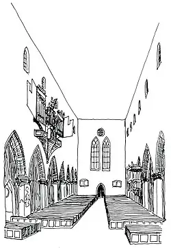 1656 baute Stadtbaumeister Knoll zwischen dem Triumphbogen am Choreingang und dem ersten Pfeilerpaar eine brücken- beziehungsweise lettnerartigeEmpore ein, vermutlich als Ort für Sänger und Instrumentalisten, die allein oder zusammen mit der Orgel musizierten, da das Schwalbennest nicht den Platz für eine größere Anzahl von Personen bot. Auch für die Aufführungspraxis der zu dieser Zeit beliebten mehrchörigen Musik lag es nahe, Musiker auf mehrere Emporen zu verteilen. Auf dieser Empore stand bis 1827 auch eine kleine Orgel, die später in die Kinderlehrkirche gebracht und dort bis 1874 verwendet wurde. Sie war wahrscheinlich vom Orgelbaumeister Siegmund Riegg angefertigt worden.[4]