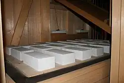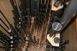 Elektrische SchleifenzugmagneteEiner der Magazinbälge mit Gewichtsteinen. Im Hintergrund rechts zwei von drei vorhandenen TremulantenSpieltisch der neuen OrgelAbstrakten der mechanischen Spieltraktur in der Orgel