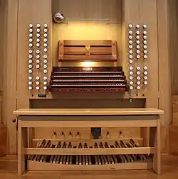 Die Registertraktur ist mechanisch und elektrisch als Doppelregistratur angelegt. Die leicht greifbaren Registerzüge machen es möglich, drei oder vier Register auf einmal zu ziehen.[15] Die zusätzlich eingebaute Setzeranlage mit vier mal acht Kombinationen auf 99 Ebenen verfügt über ein Diskettenlaufwerk, mit dem sich Registrierungen speichen und abrufen lassen. So war es möglich, den Spieltisch sehr schlicht zu gestalten. Neben der Setzerleiste unter dem ersten Manual gibt es nur noch die vier Pedalkoppeln und Sequenzer vorwärts und rückwärts als Fußtritte.