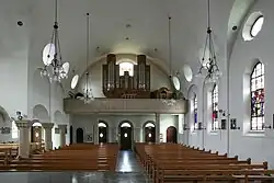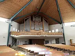 III/P | 36 | 1966 durch Kuhn auf 42 Register erweitert. 2005 neuer elektrischer Spieltisch von Mathis Orgelbau (Näfels) auf der Empore. Ab 2012 schrittweiser Umbau und Erweiterung auf 47 Register durch Thomas Gaida (Wemmetsweiler). Einzeltonsteuerung mehrerer Register und Rückführung von Registern auf den Stand von 1940. |