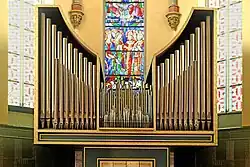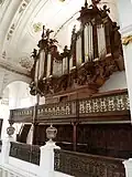 II/p | 8 | Brüstungsorgel von Guido Schumacher (1989) zwischen dem rechten und linken Orgelgehäuse mit Prospektpfeifen der Vorgängerorgel von François Joris (1926) |