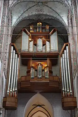 Bundesweit und teils international tätige Unternehmen errichteten auch in Schleswig-Holstein Orgeln wie Karl Schuke (Berlin) in der Ratzeburger St.-Petri-Kirche (1980) oder Detlef Kleuker (Brackwede). Von ihm stammen die Orgeln in der Nikolaikirche Kiel (1959) und der Marienkirche Husum (1963). Auf Rieger Orgelbau geht die Hauptorgel im Ratzeburger Dom von 1978 zurück. Franz Grollmann errichtete 1976 das Instrument in St. Laurentii/Itzehoe hinter dem Schnitger-Prospekt, der Schweizer Metzler Orgelbau baute 1987 die Orgel der St.-Michaelis-Kirche, Orgelbau Mühleisen (Leonberg) die Orgeln in St. Severin/Keitum (1999) und der Peter-Paul-Kirche (2006) und Gerald Woehl (Marburg) 2009 in der Nikolaikirche Flensburg die Doppelorgel: eine Rekonstruktion der Schnitger-Orgel (III/P/42) und dahinter eine große symphonische Orgel (IV/P/63).[28]