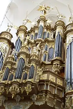 Der Orgelprospekt mit seinen im niederländischen Knorpelstil gehaltenen Schmuckmotiven zählt zu den repräsentativsten Orgelprospekten des Frühbarock. Im Mittelpunkt dieses Hauptwerks steht König David als Stammvater geistlicher Musik. An oberster Stelle befinden sich die Pfeifen des Oberpositivs.
