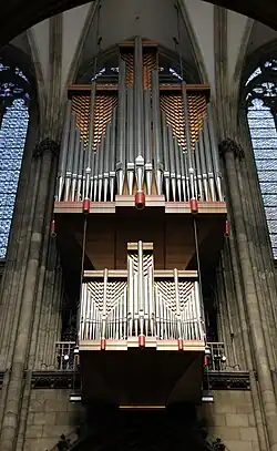 Die Orgelanlage des Kölner Domes gehört mit 143 Registern zu den größten Orgeln in Deutschland. Sie besteht aus zwei Hauptorgeln und einem Hochdruckwerk. Die Querhausorgel wurde 1948 von Hans Klais aus Bonn auf einer Empore in der nördlichen Vierung fertiggestellt, die Langhausorgel 1998 von der Orgelmanufaktur Klais errichtet, 2006 kam das Hochdruckwerk im Westbau des Domes hinzu.[2] Die drei Teilwerke lassen sich von einem gemeinsamen Spieltisch aus anspielen, der hinter dem Rückpositiv der Querhausorgel steht.