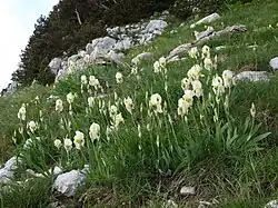 Sie wächst oberhalb der Baumgrenze oder in lichten Schlangenhaut-Kiefernwäldern in der oromediterranen Seslerion robustae Höhenstufe und wächst innerhalb von Rasen- und Hochstaudenfluren. Lokal ist sie mit Heracleum sphondyllum, Sesleria robusta, Asphodelus albus und Cattani-Lilie oder der Gelbe-Betonie, Gelber-Enzian und Peucedanum longifolium, Senecio thapsoides subsp. visianianus und Juniperus nana vorkommend.