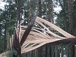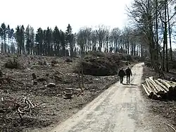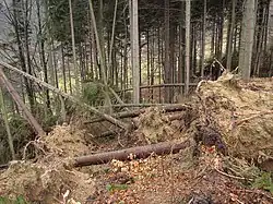 Katastrophale Folgen hatte der Orkan für die Waldbestände. In den deutschen Wäldern fielen rund 37 Millionen Festmeter Holz dem Sturm zum Opfer.[36] Im Thüringer Wald rechnet man mit etwa 500.000 Festmetern, also etwa 215.000 Tonnen Sturmholz.[37] Zum Schluss hinterließ Kyrill in Thüringen 6300 ha Kahlflächen, 4700 ha gelichteten Wald und verstreute Baumwürfe auf 200.000 ha.[38] Gründe für den dortigen Schaden waren zum einen der durch die starken Niederschläge der letzten Wochen aufgeweichte Waldboden, zum anderen die Tatsache, dass viele der Baumbestände bereits durch jahrzehntelange Luftverschmutzung geschädigt waren und zum dritten, dass es sich bei den betroffenen Beständen um Fichtenbestände handelte.