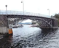 In den 1870er Jahren gab es bereits eine Holzbrücke.[1] Die heutige Brücke ist jedoch im Kern noch eine Stahlbrücke aus dem Jahre 1922. Ursprünglich wurde sie nur mit einer Fahrbahn und ohne Bürgersteig gebaut, doch durch die Inbetriebnahme einer weiteren Brücke zur Nachbarinsel Malmøya und die zunehmende Besiedlung der Inseln, zu der auch ein Yachthafen gehört, war die Brücke dem Verkehrsaufkommen nicht mehr gewachsen. Sie wurde von Oktober 2005 bis Oktober 2006 von 4,5 m auf 8,7 m Breite erweitert und ihre Tragfähigkeit erhöht. Zur Verbesserung der Sicherheit wurde auch ein Bürgersteig angebaut.[2][3]