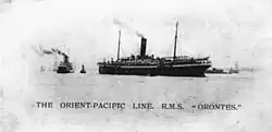 Das 9028 BRT große DampfschiffOrontes wurde bei Fairfield Shipbuilders in Govan gebaut und lief am 10. Mai 1902 vom Stapel. Das 156,54 Meter lange und 17,73 Meter breite Passagier- und Postschiff hatte einen Schornstein, zwei Masten und zwei Propeller und wurde von Dampfmaschinen angetrieben, die eine Geschwindigkeit von 18 Knoten ermöglichten. Die Passagierkapazität lag bei 200 Reisenden in der Ersten, 200 in der Zweiten und 600 in der Dritten Klasse.