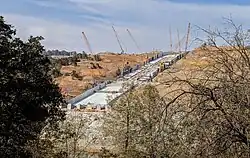 Die Bauarbeiten begannen 1957 mit Straßenverlegungen und endeten mit der Einweihung 1968. Das Baumaterial (Lehm, Sand, Kies) wurde zum größten Teil per Schaufelradbagger, Bandförderanlagen und Pendelzügen von einem ehemaligen Nassbaggerfeld, wo südlich von Oroville Gold gewonnen wurde, auf die Baustelle transportiert.[7]