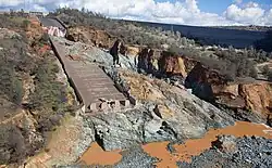 Dabei brachen ab dem 7. Februar 2017 Teile des betonierten Gerinnes aus. Um eine weiter nach oben zum Sperrenwerk voranschreitende Zerstörung des Gerinnes zu verzögern, wurde die Abflussmenge wieder verringert, was zu einem weiteren Ansteigen des Wasserspiegels im Stausee und schließlich zum Überlauf über den seitlich davon gelegenen Notüberlaufbereich führte, der jedoch über keine erosionsverhindernde Wasserableitung verfügte. Dieser Überlauf, der eigentlich den regulierbaren Hochwasserablauf entlasten sollte, wurde zum ersten Mal in seinem 48-jährigen Bestehen aktiv.[13][14] Um eine Katastrophe durch eine Unterspülung des Notüberlaufs zu verhindern, wurde die über das betonierte Hochwasserentlastungsgerinne des Staudammes abfließende Wassermenge wieder erhöht, was den Wasserspiegel des Stausees absinken ließ, jedoch zu massivem Fortschreiten der Schäden an der Schussrinne führte. Teile des Wassers der Schussrinne flossen nun neben der Rinne und führten zu massiver Erosion am Hang.[14]