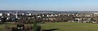 ![]() Orschel-Hagen von Süden, vom Hochhaus Tannenberger Straße 66 gesehen. Links die St.-Andreas-Kirche, dahinter die Hochhäuser an der Frankfurter Straße, dahinter Rommelsbach. Mittig die Jubilatekirche, dahinter Pliezhausen.