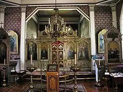 Die Kirche ist außen blau gestrichen. Diverse Ikonen und religiöse Bilder unterstreichen den prachtvollen Innenraum der Kirche.