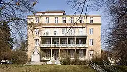 Die Anlage ist ein Hauptwerk der Architekten Alfred Mautner und Johann Rothmüller. Das monumentale Hauptgebäude vereint Elemente des späten Jugendstils, des Art déco und des Expressionismus. Diese außergewöhnliche Formgebung ist jener des Wiener Amalienbads verwandt.[1] An der Hauptfront befindet sich ein Vorbau mit Arkaden, während die Gartenfront von einer großen Loggia geprägt ist. Links und rechts schließt je ein Pavillon an. Das Foyer ist vollständig mit Wienerberger Keramik verfliest. Im Garten steht eine große Plastik Mutter und Kind aus der Bauzeit.[2]