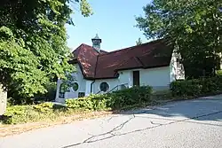 Der Rechteckbau mit seitlichen Anräumen unter einem Kreuzdach trägt einen Dachreiter. Die Glasmalereien mit der Darstellung von Heiligen sowie die Konsolfiguren entstanden in der Umbauzeit. Die barocke Figur hl. Augustinus entstand in der Mitte des 18. Jahrhunderts.