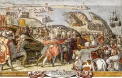 Im Südosten kämpfte das Osmanische Reich mit Portugal um die Vormacht im Indischen Ozean: 1538 kam es zur Belagerung von Diu.[27] 1547 wurden große Teile des Jemen besetzt. Der osmanische Admiral Piri Reis vertrieb 1548 die Portugiesen aus Aden und 1552 aus Maskat. Diese Gewinne waren aber nur vorübergehend, Bahrain und Hormus blieben im Besitz der Portugiesen. 1557 wurde Massaua in Eritrea erobert und blieb bis ins 19. Jahrhundert osmanisch.