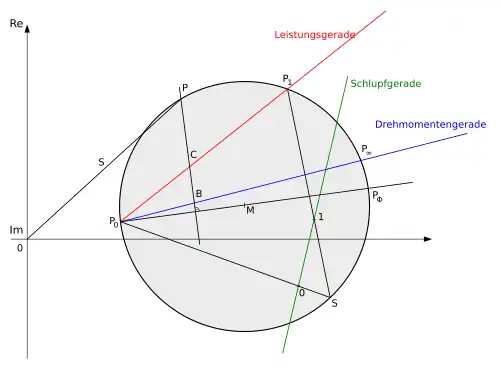 P0 bezeichnet den Leerlaufpunkt, P1 den realen Kurzschlusspunkt und P∞ den idealen Kurzschlusspunkt (Läuferwiderstand = 0). Der Durchmesser ist die Strecke zwischen P0 und PΦ. Die Leistungsgerade ist die Strecke zwischen P0 und P1. Die Drehmomentgerade zwischen P0 und P∞.