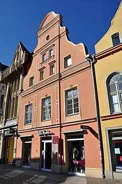 Ein hoher, abgestufter Schweifgiebel, Gurtgesimse sowie die als flache Vorlage ausgebildete, von Pilastern flankierte Mittelachse prägen die Straßenfront.