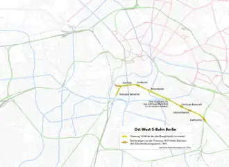 Bei den Planungen für die Umgestaltung der Bahnanlagen Berlins im Zuge der Germania-Planungen griff die Deutsche Reichsbahn die Pläne wieder auf. Hintergrund war die geplante Elektrifizierung der Görlitzer Bahn bis Königs Wusterhausen. Die Stadt- und Ringbahn sollten jedoch nicht dauerhaft mit den zusätzlichen Zügen belegt werden.[1] Der westliche Endpunkt stand zunächst noch nicht fest. Die Stadt Berlin wünschte, dass die Strecke sowohl die Leipziger Straße als auch die Straße Unter den Linden nicht befahren sollte, da sie diesbezüglich eigene U-Bahn-Pläne verfolgte. In Gesprächen zwischen dem Berliner Oberbürgermeister Lippert und den Präsidenten der Reichsbahndirektion und Reichsbahnbaudirektion Berlin, Marx und Pückel, vom 28. Februar 1938 vereinbarten beide Seiten einen Kompromiss bezüglich der künftigen Gestaltung des S- und U-Bahn-Netzes. Die Ost-West-S-Bahn sollte von Süden kommend in die Bahnhöfe Potsdamer Platz oder Anhalter Bahnhof einfädeln. Im weiteren Verlauf sollten die Züge zum Nordring oder auf direktem Weg nach Tegel fahren. Die Stadt verzichtete ihrerseits auf den Bau von U-Bahnen in der Saarlandstraße (heute: Stresemannstraße) und einen U-Bahn-Bau nach Siemensstadt. Im Gegenzug durfte die Stadt eine U-Bahn-Linie durch die Nord-Süd-Achse führen. Für den Bau war ferner ein Umbau des U-Bahnhofs Potsdamer Platz der U-Bahn-Linie A (heute: U2) vorgesehen.[2]