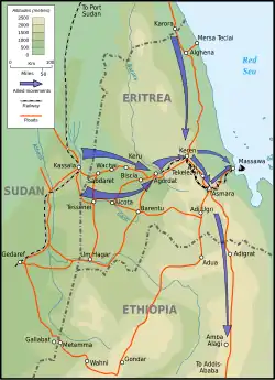 Am 19. Januar 1941 überschritten die beiden indischen Divisionen Platts die Grenze zu Eritrea.[5] Die Italiener hatten Kassala bereits geräumt und zogen sich ins Landesinnere zurück. Wavell befahl daraufhin Platt, nachzustoßen, um wenn möglich Asmara, die Hauptstadt der Provinz, zu erreichen. Gegen Monatsende kam es zu Gefechten um Agordat und Barentu, an denen auch die Deutsche Freiwillige Motorisierte Kompanie in Eritrea beteiligt war.