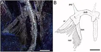 Der spangenförmige Beckengürtel („pub“) weist anterior zwei lange, stachelförmige Fortsätze („prp“) auf. Die langen Basipterygia („bas“) gelenken posterior und außen liegend am Beckengürtel. Die Bauchflossen werden von etwa 20–21 Radialia („rad“) gestützt und sind deutlich zweilappig. Der vordere Bereich wird durch einen Stab aus miteinander verschmolzenen Radialia („cr“) und die vordersten 3–4 Radialia welche direkt am Beckengürtel ansetzen, gestützt. Die stabförmig miteinander verschmolzenen Radialia sind dabei der Reihe mit den distalen Segmenten der einzelnen Radialia verbunden. Der hintere Bereich wird von einzelnen, vom Basipterygium ausgehenden, Radialia gestützt. Eine Lücke zwischen den beiden Lappen der Bauchflossen scheint jedoch nicht vorhanden zu sein.[1]