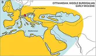 Die marinen Sedimente des Ottnangium von Rainbach im Innkreis wurden im Bereich des nordalpinen Molassebeckens am nördlichen Rand der Zentralen Paratethys abgelagert. Zu dieser Zeit war das Östliche Paratethys-Becken bereits isoliert und auch die Verbindung zwischen Mittelmeer und Indischem Ozean war abgeschnitten. Es existierten allerdings noch Meeresstraßen die eine Verbindung zwischen Zentraler Paratethys und dem Mittelmeer herstellten. Das Mittelmeer selbst stand bereits mit dem Atlantik in Verbindung. Das nordalpine Molassebecken war Teil einer dieser Meeresstraßen, die die Zentrale Paratethys über das Rhone-Becken mit dem westlichen Mittelmeer verband („Burdigalian Seaway“).[1][6]