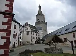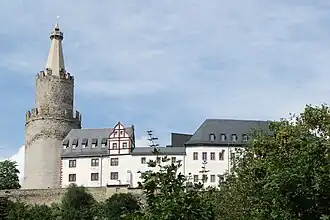 Der 54 m hohe Bergfried ist der dritthöchste und einer der ältesten erhaltenen Bergfriede Deutschlands. Der untere Teil wurde wohl bereits unter Vogt Heinrich I. angelegt. Die drei Zinnenkränze des Turms entstanden in mehreren Bauphasen, bis er Mitte des 14. Jahrhunderts mit dem achteckigen Aufsatz seine heutige Form erhielt. Die Turmspitze wurde 2011–2013 erneuert, als auch das Neue Schloss – mit europäischen Fördermitteln – eine Außensanierung erhielt. Oberhalb des zweiten Zinnenkranzes befindet sich die Türmerstube, die noch bis 1917 von einem Türmer bewohnt wurde. Den Kern des Schlosses bilden der Palas des 12. Jahrhunderts sowie ein gleichzeitig entstandener, aber kleinerer Wohnturm. Unter den Wettinern wurden die romanischen Gebäude im Stil der sächsischen Renaissance umgebaut.