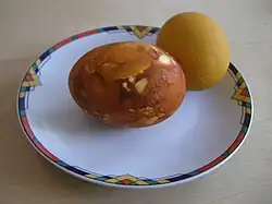 Einen anderen Erklärungsansatz verfolgte Theodor Schnitzler in seiner Studie von 1957:[8] Er verweist auf die in Zwiebelschalen gekochten und dadurch braunrot gefärbten Ostereier,[9] die in Westfalen „Fuchseier“ genannt würden. Deren Farbe erinnere an die Farbe des Hasenfells oder an das rote Fell des Fuchses. „Die ungewöhnliche Braun-Rot-Färbung des Eies wird dann mühelos der Herkunft von Fuchs und Hase zugeschrieben.“[8]