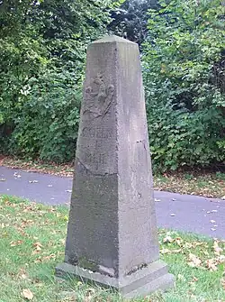 Im Jahre 1818 wurde an der Ecke Bensheimer-/Frankfurter Straße ein preußischer Ganzmeilenobelisk aus Trachyt-Gestein aufgestellt. Von diesem Meilenstein beträgt die Entfernung nach Köln eine preußische Meile (7532,48 m). Bedingt durch den weichen Stein ist das Denkmal stark verwittert und sanierungsbedürftig. Bei einem früheren Restaurierungsversuch wurde das letzte „e“ von Meile entfernt, deshalb lautet die Inschrift unterhalb des preußischen Adlers nun: „Cöln 1 Meil“.[39]