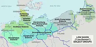 Der historische Dialekt der östlichen Neumark stand dem Südpommerschen nahe, und hierfür, sowie für die Mundarten der Kreise Dramburg und Schivelbein schlug Seelmann (1913) die Bezeichnung „Ostmärkisch“ vor.[14] Der Begriff scheint sich allerdings nicht durchgesetzt zu haben, da diese Dialekte die sprachlichen Merkmale des Märkischen nicht teilen (niederfränkisches Substrat, Palatalisierung von a vor Dental in mmk. ängere, nmk. änner „andere“, mmk.nmk. det „das“). Hingegen zeigen sie Innovationen, die dem Märkischen fehlen (intervokalisches d wird j, daher roje Blom „rote Blume“) und entsprechen in spezifischen Merkmalen ostpommerschen Varietäten weitgehend (Infinitivendung -a, mnd. ô1 als Monophthong; Diphthongierung von mnd. â zu au z. B. in Vaute „Vater“ wie im Belbucker Abteigebiet).[14] Nach den E- und O-Lauten wurde das Ostpommersche in einen nördlichen und einen südlichen Teil gegliedert.[15] Es gab u. a. eine Unterteilung um Stargard und Arnswalde, eine in der östlichen Neumark und bis etwa Tempelburg, östlich von Deutsch Krone und westlich Schneidemühl bis Driesen/Netze sowie eine andere, die u. a. in Pommerellen, dem posenschen Netzegebiet und Teilen des Kulmerlandes bis nördlich Czersk, südlich Preußisch Stargard, bis zum Kalembasee, westlich Świecie (Schwetz), Bromberg, östlich Thorn und bis Wąbrzeźno (Briesen), Radzyń Chełmiński (Rehden) und Łasin (Lessen) gesprochen wurde. In Westpreußen war, darunter in polnischen und kaschubischen Dialekten, eine Verschiebung von k nach tx.[16] Dies umfasste die Kaschubei sowie die Tucheler und Flatower Gegend.[16] In den Sprachen war im Allgemeinen die Netze die Südgrenze.[16] Im westpreußischen Kulmerland wurde das Ostpommersche bis Wąbrzeźno, Radzyń Chełmiński und Łasin gesprochen.[1] Es fiel teilweise mit einem Übergangsgebiet zwischen Ostpommern und dem Niederpreußischen zusammen. Die Westgrenze dieser ostpommersch-niederpreußischen Mischgebiete wurde durch die Westgrenze der im Niederpreußischen vorhandenen Umlautentrundung gebildet.[1] Das Übergangsgebiet endete etwa bei Chojnice (Konitz), andere Orte in diesem Gebiet waren Bytów (Bütow), Lębork (Lauenburg), Bydgoszcz (Bromberg) und Toruń (Thorn).[17] Danzig und Grudziądz (Graudenz) gehörten jedoch nicht dazu.[17] Innerhalb des Niederdeutschen in Westpreußen gab es ein großes Bündel von Isoglossen etwa auf der Linie Brodnica-Gardeja-Nowe und weiter zwischen Kościerzyna und Chojnice.[18] Die Grenze der Differenzierung zwischen Nominativ/Akkusativ und Dativ bei den starken männlichen und neutralen Pluralen verlief vom Gardno (Garder See) über Kościerzyna (Berent) und Kartuzy (Karthaus) über Skarszewy (Schöneck) bis nach Świecie (Schwetz).[19] Die östliche Grenze des Dialektgebiets mit Gerundien fiel im Wesentlichen mit der westlichen Grenze der Realisierung des mittelniederdeutschen i und u als e bzw. o zusammen.[20] Die Grenze der Realisierung von mittelniederdeutschem i und u als e bzw. o außer vor niederdeutschem nt, ng nk und g z. B. op verlief vom Łebsko (Lebasee), westlich von Lębork (Lauenburg)-Bytów (Bütow)-Kruschinsee-westlich von Starogard Gdański (Preußisch Stargard)-südlich und westlich der Weichsel.[1] Es gab eine Gutturalisierung von -nd- zum stimmhaften velaren Nasal östlich folgender Grenze: Wicko (See) - östlich von Sławno - östlich von Polanów - nördlich, östlich und südlich von Miastko - Biały Bór - nördlich und östlich von Czarne - Człuchów - westlich und südlich von Debrzno - Kamień Krajeński - nördlich und östlich von Sępólno Krajeńskie - nördlich von Czersk - westlich von Nowe.[1]