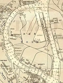 Während in den folgenden Jahren im Norden des Holm Hafenbecken angelegt wurden, dehnten sich im Süden die beiden großen Danziger Werften, die Kaiserliche Werft und die Danziger Schichau-Werft über die Weichsel aus. 1895 hatte der Wohnplatz Holm noch 316 Einwohner. Mit Wirkung vom 15. November 1902 wurde die Insel in die Stadtgemeinde Danzig eingemeindet.[1] Auf dem Holm befand sich ein Außenarbeitslager der Marine-Bauleitung des KZ Stutthof.