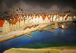 Bis zur Neugründung Lübecks 1157 war Schleswig Umschlagplatz des deutschen und nichtdeutschen Ostseehandels. Es hatte einen großen Teil der früheren Handelsbeziehungen von dem am anderen Ufer der Schlei liegenden Haithabu, des um die Mitte des 11. Jahrhunderts zerstörten bedeutendsten Handelsortes der Wikinger übernommen. 1095 erfolgte der Ausbau und die Rekonstruktion des Schleswiger Hafens, was einen anhaltenden Seehandel belegt. Hier erfolgte die Überwindung der jütisch-holsteinischen Landenge, deren Weg zu einem Teil auch zu Land überwunden werden musste (Eider-Treene-Schlei-Weg).[11] Als Vermittler des Handels zwischen Nord- und Ostsee blühte das vom dänischen Königtum geförderte Schleswig in der ersten Hälfte des 12. Jahrhunderts zum wichtigsten Handelsort im westlichen Teil des Ostseeraums auf.[12] Es hatte zudem schon seit der frühen Wikingerzeit den Rheinlandhandel und Ostseehandel, von Schleswig ausgehend, verbunden.[13]