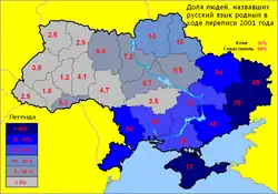 Der Anteil derer, die Russisch als Muttersprache sprechen, ist jeweils höher als der der ethnischen Russen, da es auch ethnische Ukrainer und Angehörige anderer Nationalitäten gibt, die Russisch als Muttersprache angeben. Der Anteil liegt am höchsten in der Autonomen Republik Krim (77,0 %), Donezk (74,9 %), Luhansk (68,8 %), Saporischschja (48,2 %) Charkiw (44,3 %) (und Odessa in der Südukraine (41,9 %)).[3]