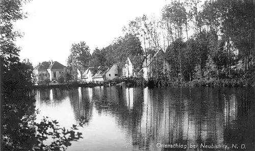 Ottenschlag wurde im Jahre 1285 erstmals urkundlich erwähnt. Die Anlage von Ottenschlag und die bis 1945 gesprochene Ui-Mundart (nordbairisch) mit ihren speziellen bairischen Kennwörtern, weist auf eine Besiedlung durch bairische deutsche Stämme aus dem oberpfälzischen Raum hin, wie sie nach 1050, aber vor allem im 12/13. Jahrhundert erfolgte.[2] Wegen der geringen Gemeindeeinnahmen mussten die Einwohner Sonderleistung erbringen um öffentliche Ämter innerhalb des Ortes zu erhalten, So zum Beispiel der Nachtwächter oder der Glockenläuter. Die Ortschaft gehörte stets zur Herrschaft Neuhaus.[3] Die Matriken werden seit 1705 bei Neuhaus geführt. Die Einwohner von Ottenschlag lebten von der Forst-, Vieh- und Landwirtschaft. Neben der Landwirtschaft gab noch Kleingewerbe, eine Molkereigenossenschaft und eine Ziegelfabrik.