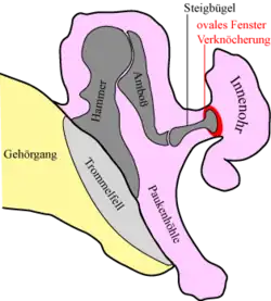 Die Otosklerose ist eine Erkrankung des Knochens, der das Innenohr umgibt (Labyrinthkapsel). Hierbei kommt es zunächst zu entzündungsähnlichen Knochenumbauprozessen. Weiterhin kommt es durch eine Fixierung der Steigbügelfußplatte im ovalen Fenster zu einer langsam zunehmenden Schallleitungsschwerhörigkeit. Erkrankungsherde im Bereich der Schnecke können zusätzlich eine Innenohrschwerhörigkeit verursachen.