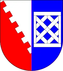 Blasonierung: „Gespalten. Vorn von Silber und Rot im Zinnenschnitt schräg geteilt. Hinten in Blau schwebend das silberne, oberhalb des Tores der ortstypischen historischen Bauernhäuser angebrachte Holzgefüge, das in einem quadratischen Rahmen ein über eine Raute gelegtes Andreaskreuz zeigt (sog. Bauerntanz).“[7]
