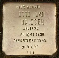 - 2004 wurde in Segnitz vor Otto Driesens Geburtshaus ein Stolperstein für ihn verlegt. → siehe auch: Liste der Stolpersteine in Segnitz