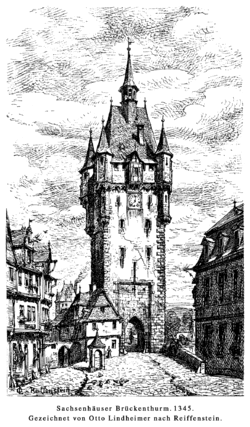 Sachsenhäuser Brückenturm, Holzschnitt einer Strichzeichnung von Otto Lindheimer