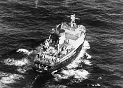 - Foto des Schiffs, mit Besatzungsmitgliedern auf dem Eis