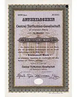 Anteilschein der Central-Torfkohlengesellschaft mit Unterschrift Vollbehrs