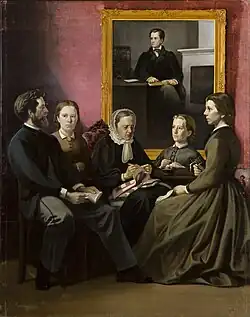 - Die Familie Zoege von Manteuffel – der Maler (links), seine Mutter (Mitte) und seine drei ledigen Schwestern – vor einem Bild des Vaters Carl Magnus, Öl auf Leinwand, Kumu; Abb. in: Lexikon der Düsseldorfer Malerschule, Band 3, S. 459