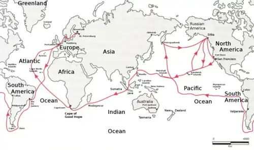 Die eingeschlagene Route um Kap Hoorn nach Talcahuano in Chile und weiter nach Kamtschatka ähnelte derjenigen der ersten von Kotzebue geführten Expedition. Neben San Francisco besuchte er auch erneut die Marshallinseln. Dabei vermaß er erstmals das Bikini-Atoll, dem er nach Johann Friedrich Eschscholtz den Namen Eschscholtz-Inseln gab.