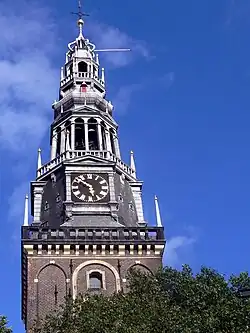 In der Glockenstube hängen vier Glocken: Glaube (b0, ≈3.700 kg, ø 1.750 mm), Hoffnung (d1, ø 1.400 mm), Liebe (f1, ø 1.170 mm) und Freiheit (b1, ø 870 mm). Die Glocken hängen an verkröpften Jochen und werden seit jeher von Hand geläutet. In der unteren Laterne des Turmhelms hängt ein Carillon, das ursprünglich im Jahre 1658 von François Hemony gegossen wurde.[4] Die Tonfolge reicht von b0 (≈3.400 kg), c1, d1 chromatisch bis b4. Von den ursprünglichen 35 Hemony-Glocken sind heute nur noch die größten 14 erhalten (b0 bis cis2), die anderen sind von Eijsbouts. Das Glockenspiel ist in mitteltöniger Stimmung gestimmt. Der Stokkenspieltisch wurde 1991 von der Glockengießerei Eijsbouts gebaut.