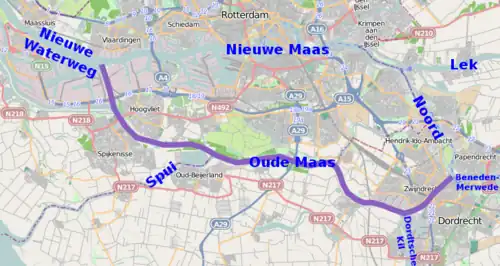 Die Oude Maas, in der heute normalerweise kein Maas-Wasser mehr fließt, ist rund 30 Kilometer lang. Bei niedriger Wasserführung der Flüsse wird ihr aber aus dem Haringvliet u. a. auch Maas-Wasser zugeführt.[Anm. 1] Der Haringvlietdam wird dann geschlossen, sodass Wasser aus dem Vliet durch die Dordtsche Kil und die Spui zur Oude Maas fließt, wodurch schließlich der Wasserstand im Nieuwe Waterweg, an dem der Europoort liegt, hochgehalten wird.