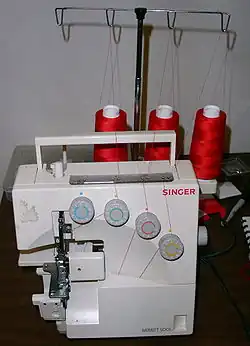Eine Overlock-Nähmaschine (kurz: Overlock) dient dazu, Stoff in einem Arbeitsgang mit einem Overlockstich zusammenzunähen, zu versäubern und präzise abzuschneiden.[1][2] Dies ist sehr zeitsparend und ermöglicht das schnelle Erstellen von professionellen Nähten. Früher wurde die Overlock hauptsächlich in der Industrie benutzt. Mittlerweile wird sie auch in vielen Privathaushalten verwendet.[3] Eine Overlock kann eine normale Nähmaschine nicht ersetzen, da sie für viele Funktionen, wie das Annähen von Knöpfen und das Nähen von Knopflöchern ungeeignet ist. Dafür ist sie auf Stoffkanten spezialisiert und kann diese schneller und präziser bearbeiten als eine gewöhnliche Nähmaschine. Ausgestattet ist jede Overlock mit mindestens zwei Fäden. Je nach Modell können Sticharten mit zwei, drei, vier oder fünf Fäden erstellt werden. Zwei Messer, ein oberes und ein unteres, sind für das Abschneiden des Stoffes zuständig. Das obere Messer ist beweglich, während das untere feststeht. Bei den meisten Overlock-Nähmaschinen kann das obere Messer deaktiviert werden, damit Stoff auch bearbeitet werden kann, ohne ihn abzuschneiden. Jede Overlock besitzt des Weiteren eine oder zwei Nadeln und zwei Greifer, einen oberen und einen unteren. Damit können verschiedene Nahtsorten erstellt werden.