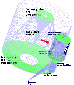 Der geplante optische Aufbau bestand aus einem sphärischen Primärspiegel, einem planen Sekundärspiegel und einem vierelementigen katoptrischen Korrektor. Der sphärische Primärspiegel lässt sich aus uniformen Segmenten zusammensetzen; der ebene Sekundärspiegel ist vergleichsweise unempfindlich gegen Lageänderungen, die sich bei der Größe des Teleskops nur schwer vermeiden lassen. Der Korrektor gleicht die sphärische Aberration des Primärspiegels aus und beinhaltet die adaptive Optik, welche atmosphärische Störungen des Lichteinfalls kompensiert. Der Korrektor müsste auch die relativ starke Deformation der offenen Spiegelkonstruktion durch Wind ausgleichen.