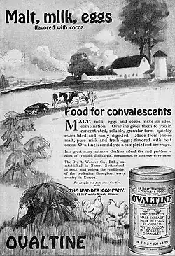 Albert Wander, der Sohn des aus Osthofen in Rheinhessen stammenden Georg Wander, der in Bern das Unternehmen Wander AG gegründet hatte, entwickelte zusammen mit W. Lanwer einen löslichen Malzextrakt, was 1904 zur Entwicklung von Ovomaltine führte.[4] Es wurde damals als nährendes Getränk für «geistig und körperlich Erschöpfte» bezeichnet. Auch die Dr. A. Wander GmbH in Osthofen vertrieb das Diätetikum Ovomaltine (als Roborans in trockener Form aus Malzextrakt, Vollmilch, Eiern und Kakao).[5]