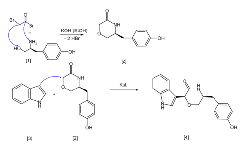 Eine Arbeitsgruppe der Butler University stellte Oxazinin-3 durch Umsetzung von Bromessigsäurebromid mit dem α-Aminoalkohol (1) (Reduktionsprodukt des Tyrosin) zum Zwischenprodukt (2) und anschließender Reaktion mit Indol (3) zum Endprodukt (4, Oxazinin-3) her:[3]