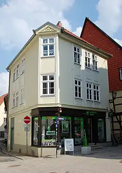 Das Fachwerkhaus entstand Ende des 18. Jahrhunderts, geht jedoch auf deutlich ältere Vorgängerbauten zurück. So ist auf der Südseite des Erdgeschosses ein massives aus dem Mittelalter stammendes Quadermauerwerk in das Gebäude einbezogen. Die Fassade des Hauses ist verputzt und im Stil des Klassizismus gestaltet. Markant ist die zur Kreuzung hin abgeschrägte Ecke des Gebäudes, die die Ecksituation betont.