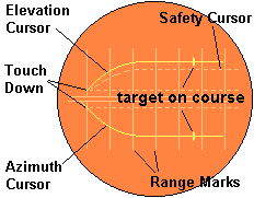 Entsprechend ist im unteren Bild die Draufsicht der gedachten Verlängerung der Mittellinie der Landebahn, dem Aufsetzpunkt und den Entfernungsmarken. Dieses untere Bild zeigt die von der Antenne zur horizontalen Sektorabtastung erfassten Daten. Es wird daher auch mit Azimut-Bild bezeichnet. Der Entfernungsmaßstab hatte in manchen Präzisionsanflugradargeräten eine logarithmische Einteilung, so dass der für den Anflug wichtigere Nahbereich eine bessere Auflösung erhielt.