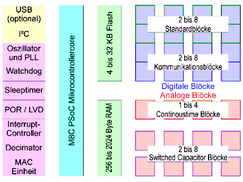 Die ‚Blöcke‘ in den PSoC sind kleine, in sich getrennte, Arrays. Diese Arrays werden bei der Programmentwicklung vorkonfiguriert, können aber auch während des Betriebs andere Funktionen bekommen; dies ist leicht durch Ändern einiger Register vom Programm zu erledigen. Neben der Hauptunterscheidung Analog und Digital gibt es weitere kleine Unterscheidungsmerkmale.